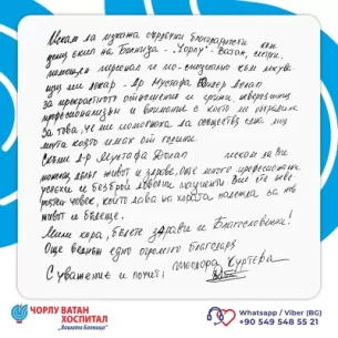 След петдневна хоспитализация и проследяване, г-жа Куртева беше изписана от болницата усмихната и в добро общо здравословно състояние. Преди да си тръгне, г-жа Теодора Куртева изказа своите искрени благодарности на Д-р Мустафа Йондер ДОЛАП и екипа на частна болница „Чорлу Ватан“.