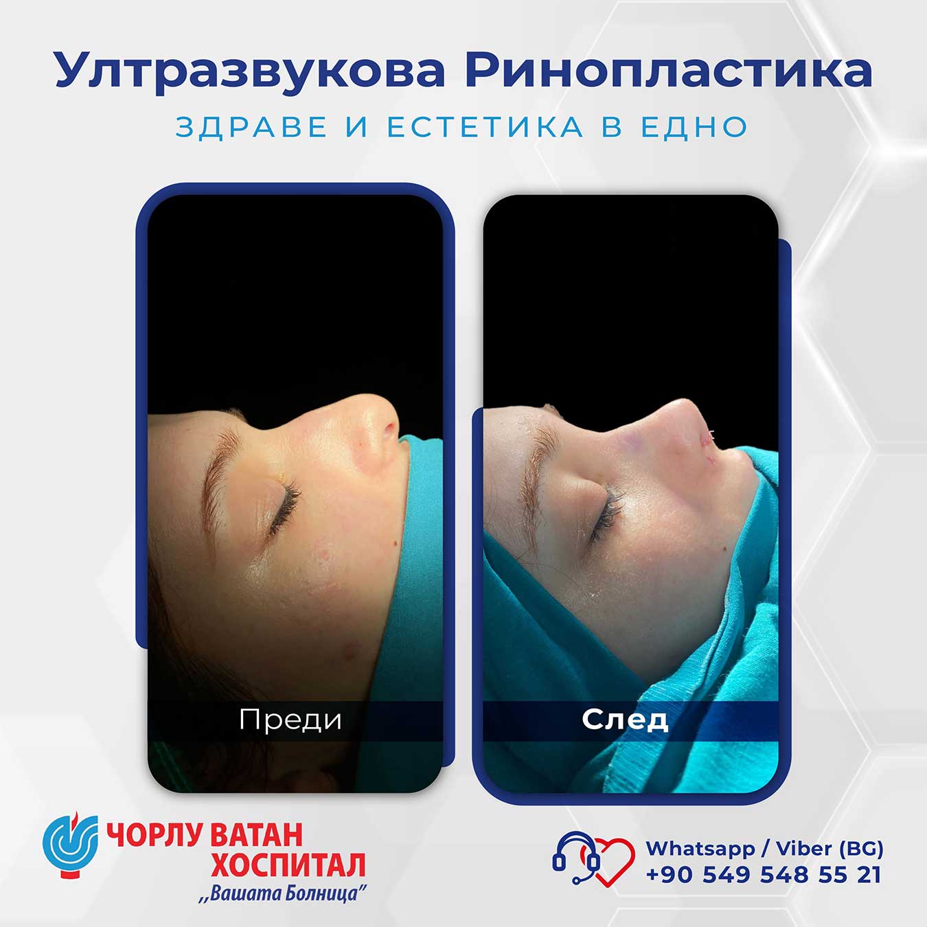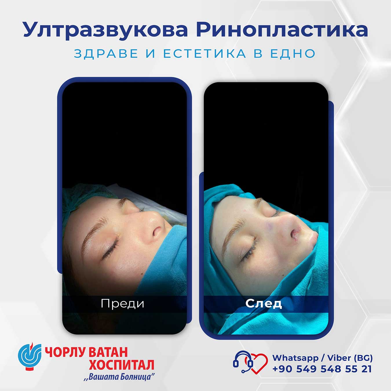 В болницата ни интервенцията Ринопластика се извършва по Ултразвуков Mетод. Това е най-съвременния метод за извършване на Ринопластика, който се прилага в момента, и едно от основните му предимства е, че е метод при който с помощта на съвременната технология значително се облекчава следоперативния период за пациента. Образуването на постоперативни отоци и синини около очите е сведено до минимум, тъй като за разлика от класическия метод при Ултразвуковата Ринопластика не се извършва чупене на костта, а се използва апаратура която с помощта на микровибрации, генерира ефективни разрези. По този начин специалистът моделира фино, и с изключителна прецизност костните и хрущялните структури на носа. Така лекаря може да извърши естетична или функционална корекция на носа с перфектен контрол и минимално кървене.