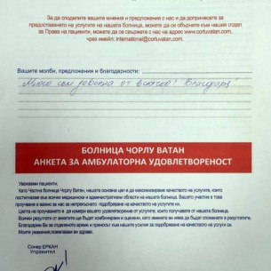Пациентката ни Иванка Якимова от България, предпочете Болница Чорлу Ватан за Цялостен Преглед. След като приключихме всички прегледи и изследвания в рамките на същия ден,  изпратихме  пациентката с добри новини.
